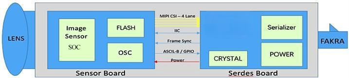 The camera includes a sensor board and a server board. FLASHcan store4 Mbytes of startup settings. UsingMaxim 96701 Serializer. The8-bitYUV422 data from the built-in ISP is serialized out byMaxim serializer.