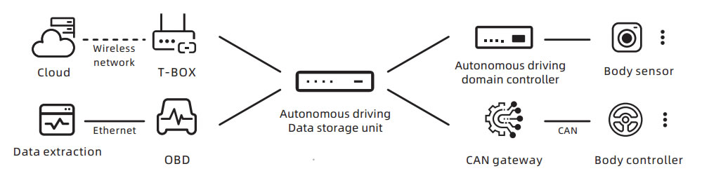 DSSAD,The vehicle-end system communicates with the autonomous driving domain controller and CAN gateway to collect and store data from automotive sensors, autonomous driving systems, vehicle actuators, and in-vehicle communication. It can also upload data elements to the cloud storage via T-BOX and supports data extraction and parsing by the PC end.