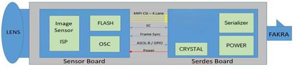 The camera includes a sensor board and a server board, and the internalFLASH can store4 megabytes of calibration settings. Use Maxim 96717F serializer. The8-bitYUV422data from the built-in ISP is serialized out byMaxim serializer.