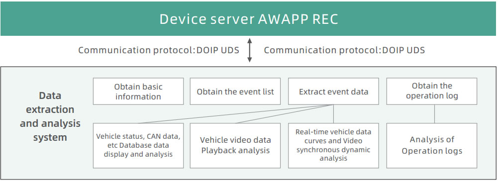 Data extraction: Data transmission is accomplished through the DoIP/UDS automotive diagnostic protocol (ISO 13400 / ISO 14229), and data storage is carried out via a database.